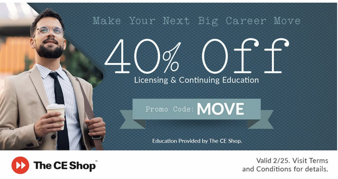 Real Estate Success Center is affiliated with The CE Shop and will receive a portion of the tuition. The purpose of the affiliation is to offer students options of platforms and prices to fit their needs.